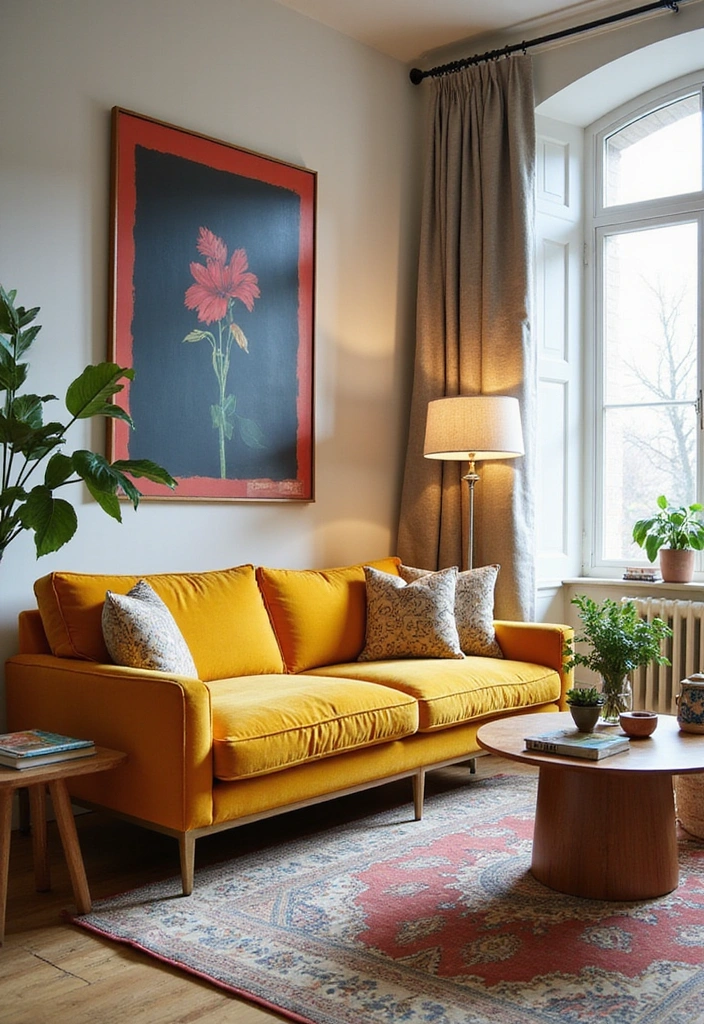 When choosing statement pieces, it’s best to stick to one or two standout items to avoid overwhelming the space. The bold sofa and unique coffee table strike the perfect balance. Opt for colors that contrast with your walls and other furnishings for a dynamic look, just like how the orange sofa pops against a neutral background.