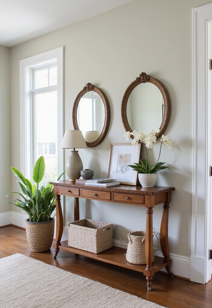 For added depth and to make the space feel larger, incorporate some decorative wall mirrors into your gallery. The rustic wood frame will complement your art while reflecting light and creating an inviting atmosphere.