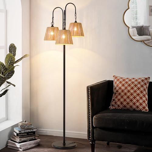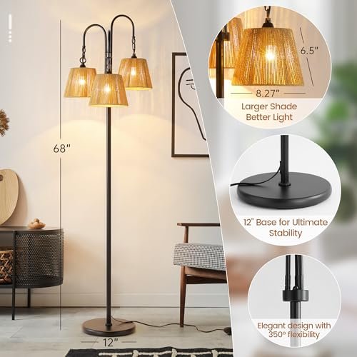 68″ Rattan Floor Lamp – 3-Light Boho Tree Light with Natural Shade for Coastal & Bohemian Decor
