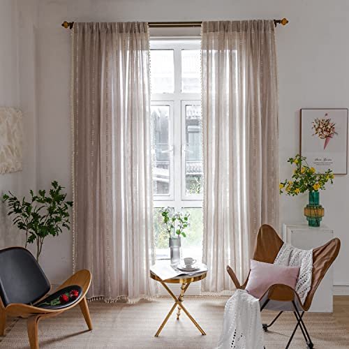 84-Inch Linen Curtains with Embroidered Stripes – Light Filtering Tassel Boho Drapes for Living Room or Bedroom, 2 Panels (52″W x 84″L, Khaki)