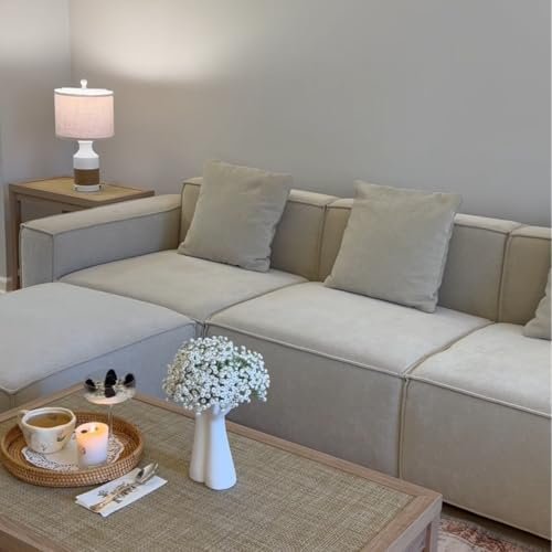 Acanva Luxury L-Shape Modular Sectional Sofa Set with Ottoman & Chaise, Cream Linen-Like Finish.