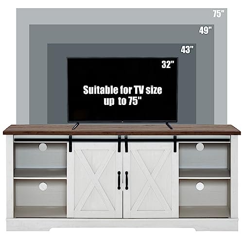 AMERLIFE 4-Piece Farmhouse Living Room Set: Includes a Sliding Barn Door TV Stand, Coffee Table, and Two End Tables with USB Charging. Distressed White, 66″.