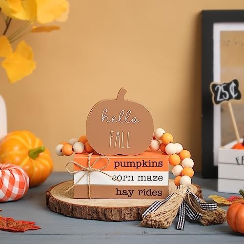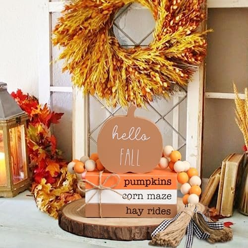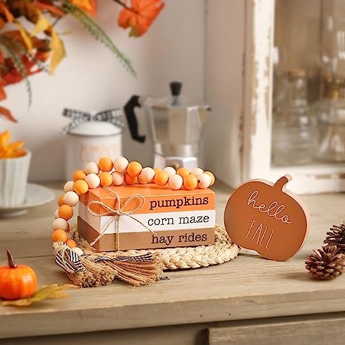 Autumn Pumpkin Tiered Tray Decor, Wood Book Stack & Thanksgiving Home Signs for Farmhouse Style.