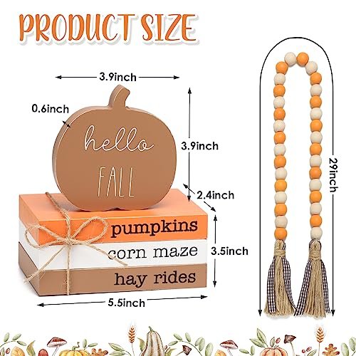 Perfectly Sized for Versatile Display: The charming book stack measures 5.5 x 3.5 x 2.4 inches, while the lovely pumpkin sign is 3.9 x 3.9 x 0.6 inches. At 29 inches long, our elegant bead garland complements any setting. Adorned with heartwarming phrases like "Sweater Weather" and "Hello Fall," these pieces beautifully capture the essence of autumn.