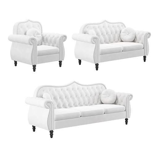 AVZEAR 3-Piece Mid-Century Modern Chesterfield Velvet Sofa Set with Tufted White Couch.