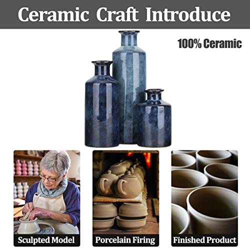 Blue Ceramic Vase Set – 3 Small Farmhouse Vases for Home, Living Room, Table, and Fireplace Decor