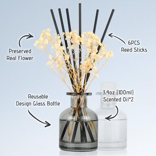 Complete Diffuser Package: This luxurious set includes two 3.38 fl oz bottles of high-quality liquid aromatherapy, two bags of dried flowers (personalize them to your taste), 12 elegant black fiber sticks, and a stunning, gift-ready box. Whether you want a calming environment or an invigorating space, we’ve got something for you!
