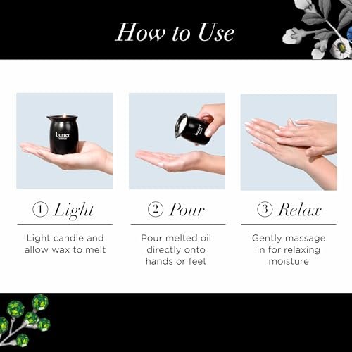 - Massage: Once the flame is out, pour a small amount into your hands and gently work it into your skin.