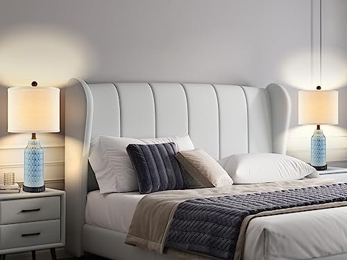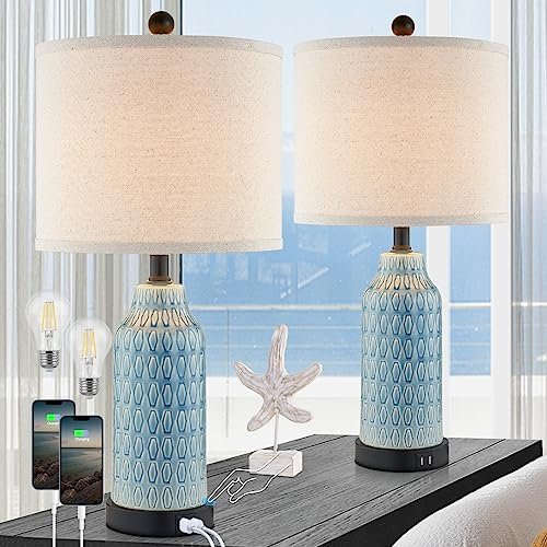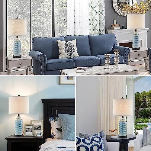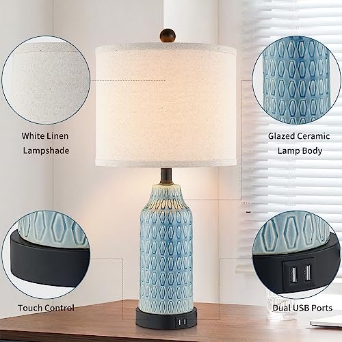 Cinkeda Set of 2 Ceramic Touch Lamps with USB Ports, 3-Way Dimmable Blue for Bedroom & Living Room. Bulbs Included.
