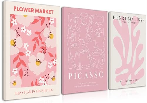 Djmwtb Matisse Picasso Pink Canvas Art Set: 3 Framed Abstract Flower Prints for Girls’ Room, 12x16in.