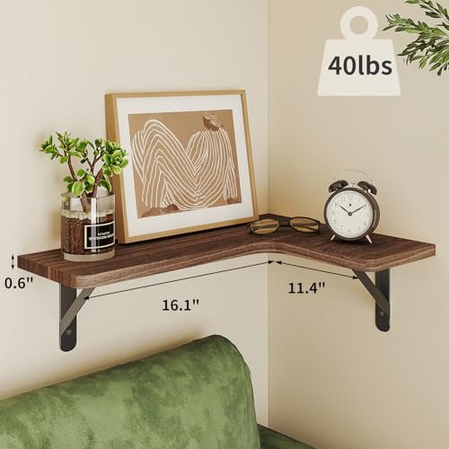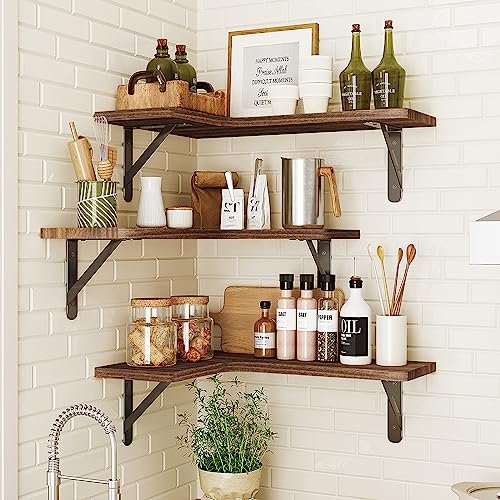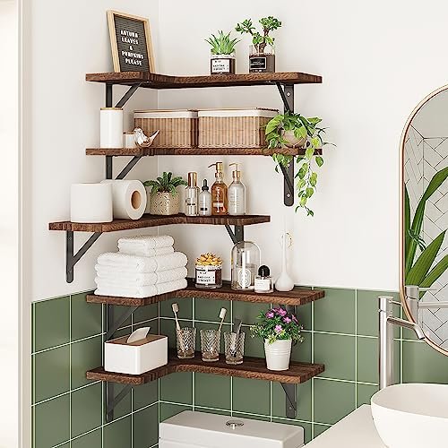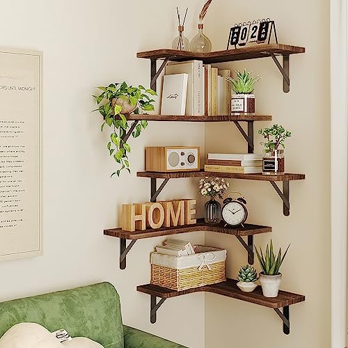 Fixwal Set of 5 Corner Floating Shelves – Rustic Wall-Mounted Wood Storage for Home Decor, Dark Black.