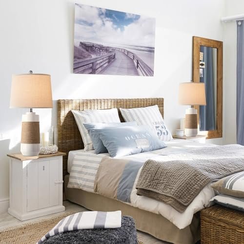 Hamucd White Boho Ceramic Lamps with Rope – Set of 2 Nautical Coastal Bedroom & Living Room Table Lamps