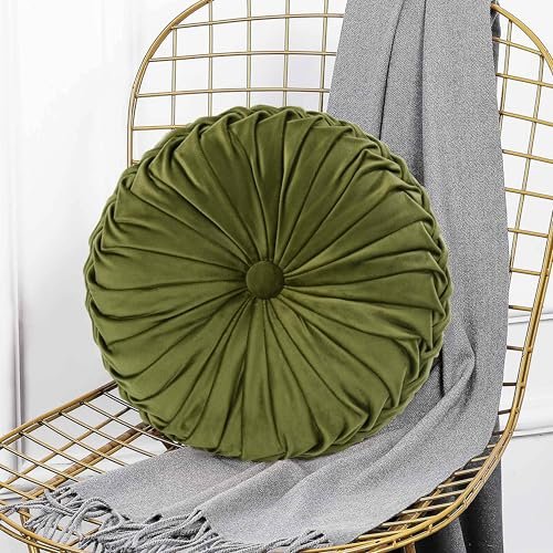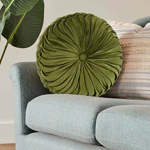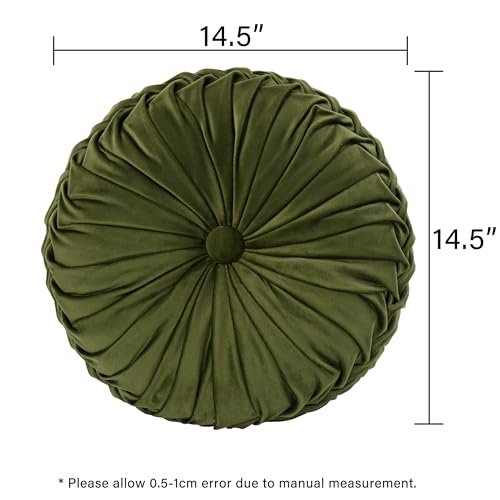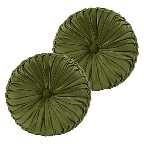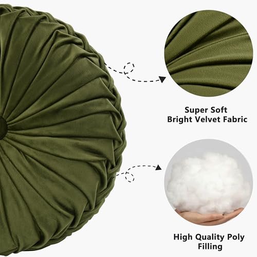 HIG Set of 2 Vintage Velvet Round Pleated Throw Pillows, Olive, 14.5″ Diameter – Stylish Accent Pillows for Sofas, Chairs, and Beds.