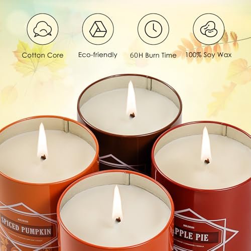 Introducing the Molensun Fall Candle Set—a delightful 4-pack of scented candles that capture the essence of the season. Infused with charming scents like Hello Fall, Apple Pie, Spiced Pumpkin, and Cinnamon Clove, these candles evoke feelings of warmth, happiness, and the joyous spirit of harvest. Turn your space into an inviting haven where comfort meets nostalgia, making it the perfect setting for family gatherings or cozy nights in.