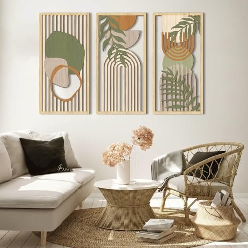 IARTTOP 16×32 Inch Boho Mid-Century Modern Wood Wall Art – Set of 3 Abstract Green Decor for Bedroom, Living Room, Office, Kitchen.