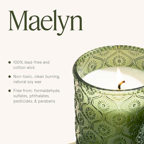 Elevate your decor with the exquisite Maelyn Collection. Each candle comes luxuriously encased in elegant glass, inspired by ancient botanical gardens and classical European estates. The intricately embossed floral patterns create a tactile sensation while the warm, neutral hues add a touch of historical grandeur and natural charm to any room.