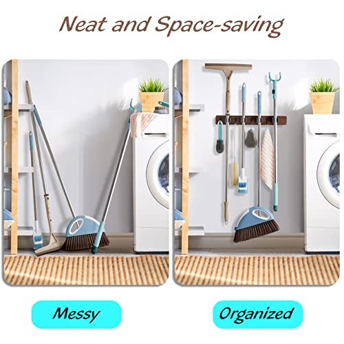 OUTNILI Rustic Wood Mop and Broom Holder – Wall-Mounted Organizer for Garage, Closet, and Kitchen with 4 Slots & Hooks