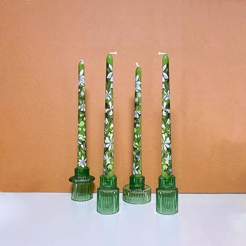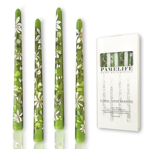 PAMELIFE 4-Pack Floral Taper Candles: 10-Inch Unscented Daisy Candlesticks in Spring Matcha Green.