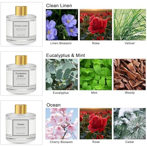 Pierides Reed Diffuser Set of 3: Clean Linen, Eucalyptus & Mint, Ocean Scents, 50ml, Ideal for Home, Living Room, Bathroom Air Freshener.