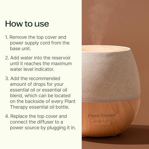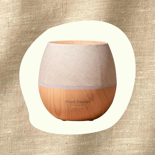 Plant Therapy Drift Linen Diffuser: Stylish linen cover, mist options, and color-changing light for spaces up to 320 sq ft.