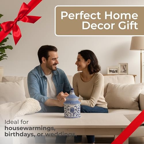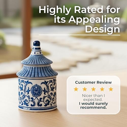 Plumeria Chinoiserie Candle Holder Jar – Elegant Pagoda Taper Candle Holders for Home & Office Decor, 5″x8″, Blue & White