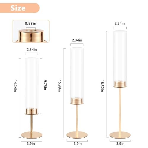 Chic and Classic Design: The understated yet luxurious design of our gold candle holders pairs beautifully with removable hurricane cylinders. The varying heights create a breathtaking visual effect, with candlelight dancing between high and low levels, setting the perfect mood for romantic evenings, festive gatherings, and memorable celebrations.
