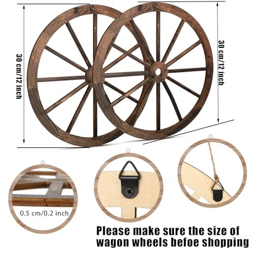 Elevate your home decor with our stunning wooden wagon wheels! Measuring approximately 30 x 30 x 0.5 cm (11.81 x 11.81 x 0.2 inches), these beautifully crafted pieces are the ideal size for enhancing your study room, bedroom, or garage. Before you indulge in this rustic charm, just double-check the dimensions to ensure a perfect fit!