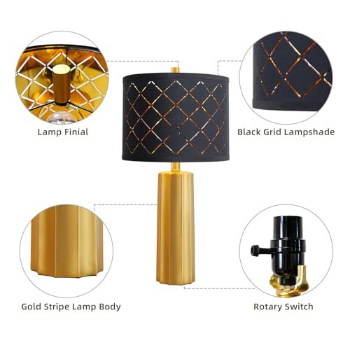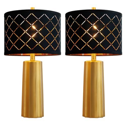 RORIANO Set of 2 Gold Modern Table Lamps with Black Grid Shade – Perfect for Living Room or Bedroom, Includes 2 Bulbs