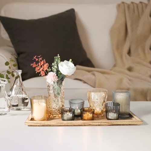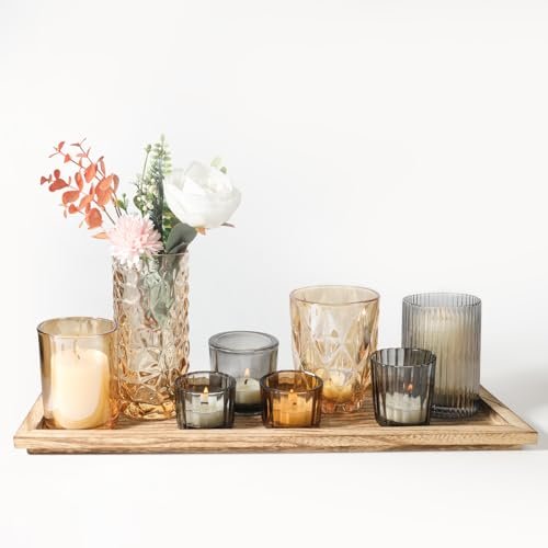 Elevate your home decor with our stunning 8-piece set featuring a solid paulownia wood tray and 8 beautifully assorted brown glass votive holders. Each holder showcases unique sizes and hues, bringing a warm, rustic charm that enhances any room’s atmosphere.