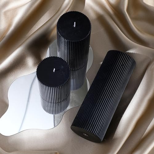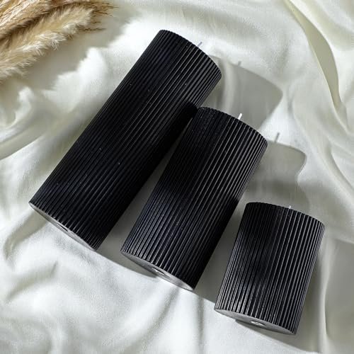 Set of 3 Conelist Ribbed Pillar Candles: Black Aesthetic Soy Wax, Scented Orchids, 4″, 6″, 8″. Perfect for Home Decor.