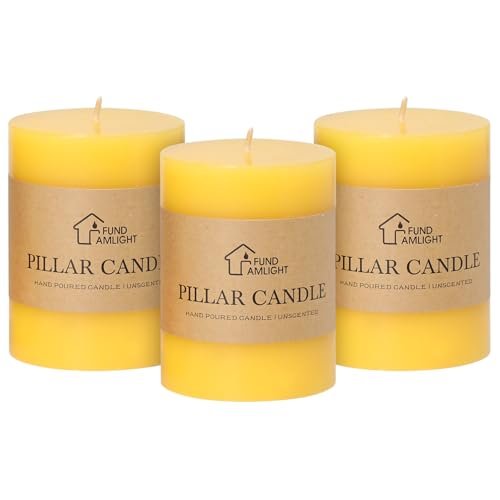 Set of 3 Unscented 3×4 Inch Yellow Pillar Candles – Dripless, Long-Lasting Decor for Weddings and Tables