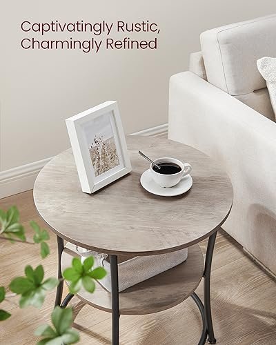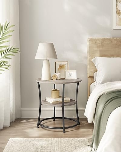 VASAGLE 2-Tier Round Side Table – Steel Frame Nightstand for Small Spaces, Heather Greige & Black