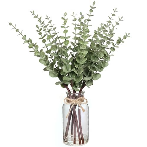 VIERENA 17.5″ Eucalyptus Stems in Glass Vase with Faux Water – Ideal for Farmhouse Centerpiece Decor (Sage Green)