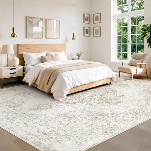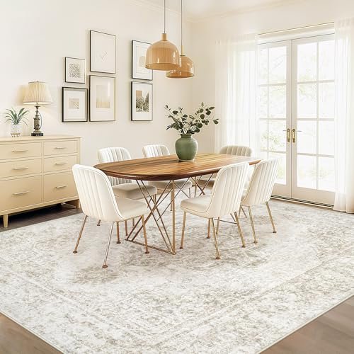 Washable 8×10 Vintage Boho Area Rug for Living Room, Bedroom, Dining, & Office – Non-Slip, Low Pile (Beige).