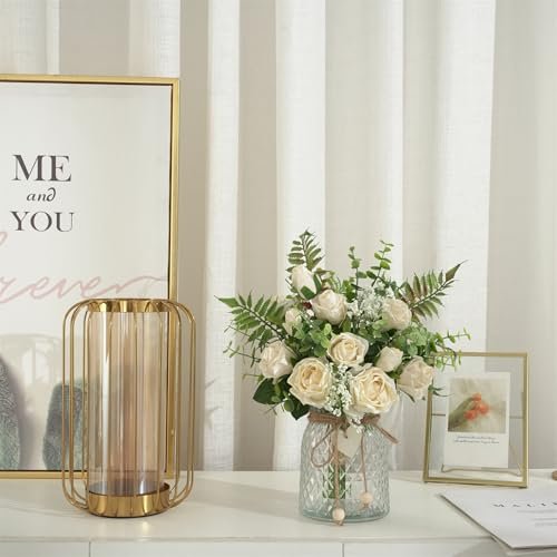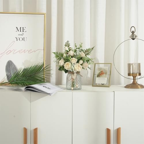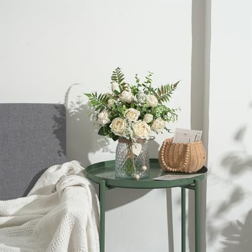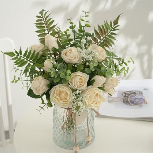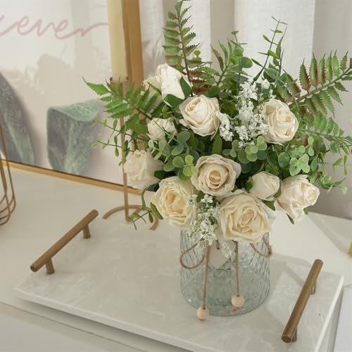 White Silk Roses in Vase – Faux Eucalyptus Flower Arrangement for Home or Office Decor