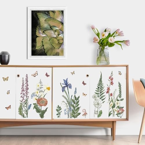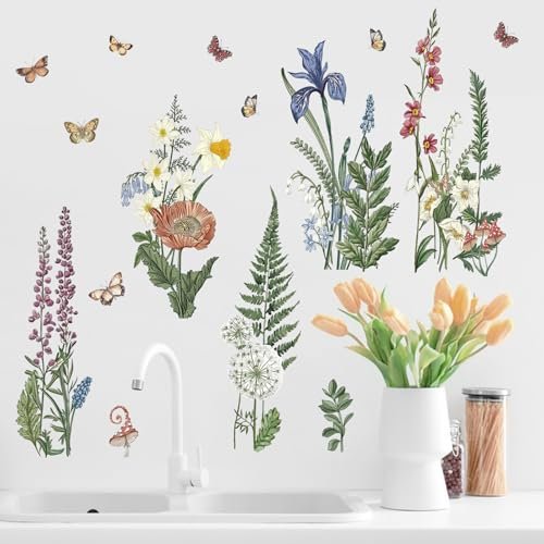 Yovkky Spring Summer Flower Fern Wall Decals: Botanical Butterfly Decor for Bedroom, Living Room, and Kitchen
