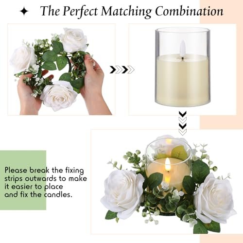 Realistic Elegance: Immerse your space in beauty! Each candle ring is meticulously designed with vibrant white roses and lush green leaves that mimic the look of fresh flowers. These LED flameless candles flicker just like genuine candles encased in clear acrylic shells, adding an air of authenticity to your decor. Perfect for creating a romantic atmosphere, these rings transform ordinary spaces into enchanting retreats.