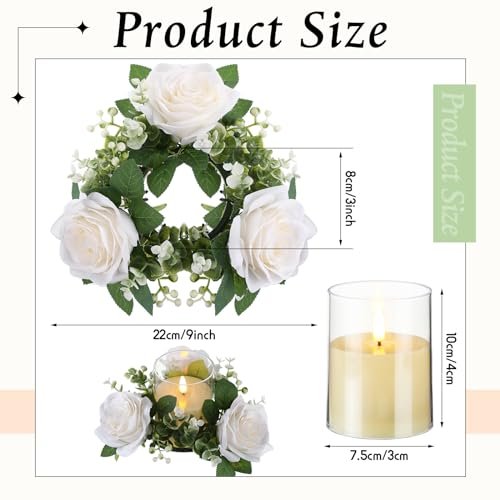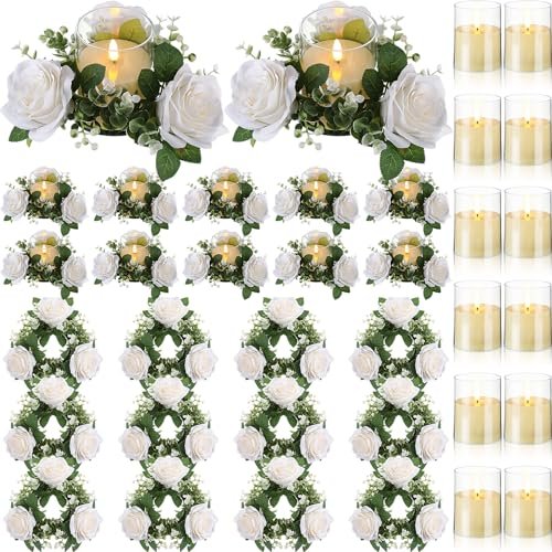 Yunlly 3-Inch Artificial Rose Candle Rings for Weddings: White Eucalyptus Centerpieces, 12 Pcs, LED Flameless Decor for Parties, Valentine’s & Mother’s Day.