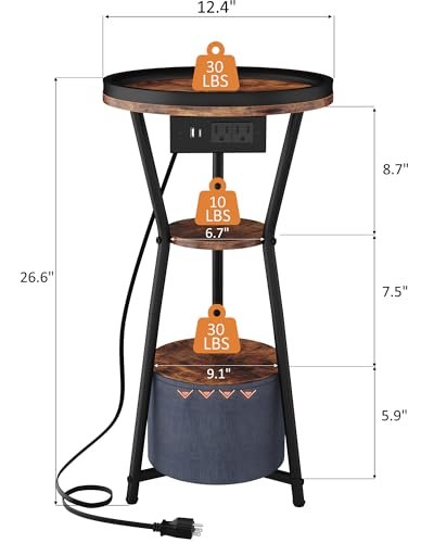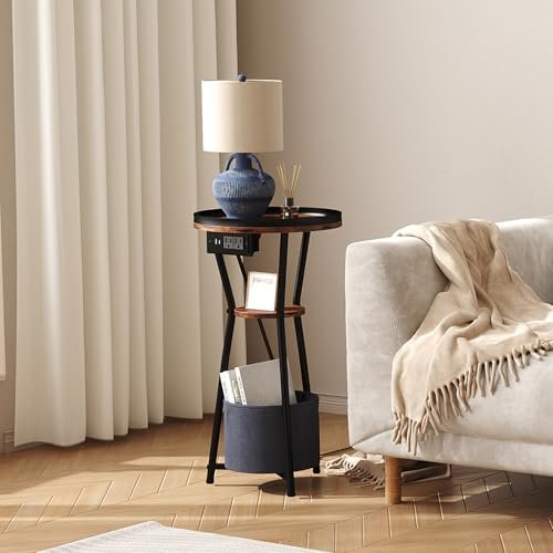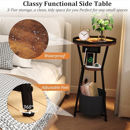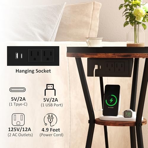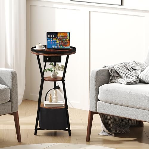 Yusong Round Side Table with Charging Station – Small 3-Tier Industrial Accent Table in Rustic Brown for Living Rooms and Bedrooms