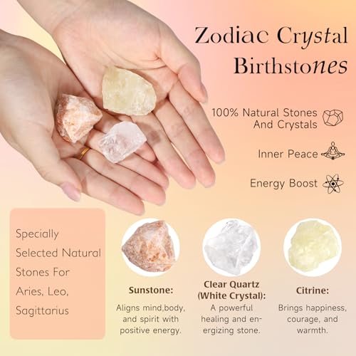 This dynamic gift set includes three powerful rough crystals—Sunstone, Clear Quartz, and Citrine—specifically chosen to resonate with the spirited natures of Fire Signs. Sunstone sparks confidence and vitality, Clear Quartz amplifies focus and energy, and Citrine radiates joy and inspiration. Harness these energies to stay motivated on your unique journey!