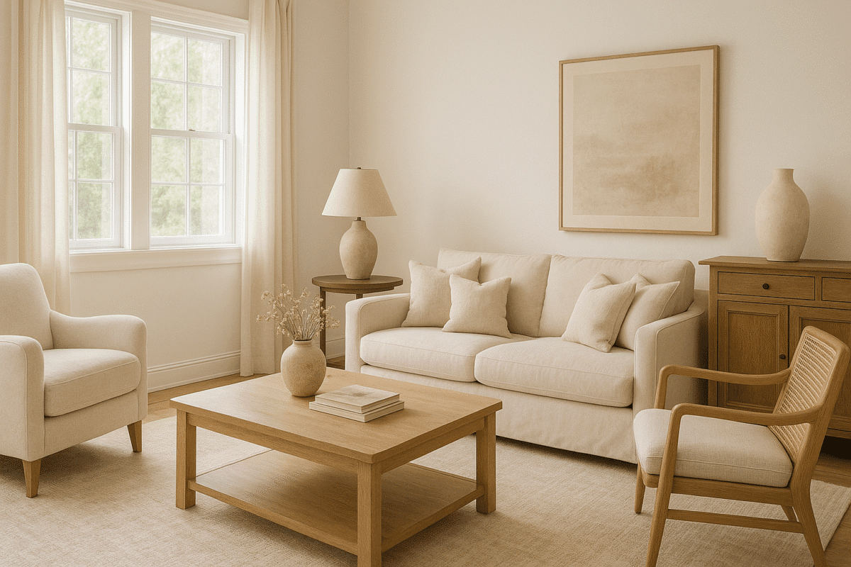 Neutral color palettes in living rooms create a calming backdrop that pairs beautifully with a variety of furniture styles. Modern minimalist, Scandinavian, and rustic pieces add warmth and texture without overpowering the space.