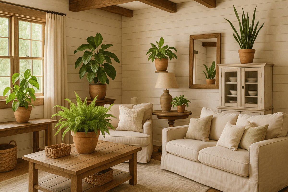 Incorporate plants into a farmhouse living room by choosing rustic pots, like terracotta or wooden planters. Place greenery on open shelves, side tables, or in woven baskets to add natural charm and warmth to the space. Incorporating plants into farmhouse style living room decor enhances the space with natural beauty, texture, and a cozy ambiance. Key ways include using potted greenery, hanging planters, and rustic wooden or metal containers to complement the farmhouse aesthetic. Plants improve air quality, add vibrant color, and create a welcoming atmosphere. Their organic shapes and earthy tones perfectly balance the simplicity and charm of farmhouse design, making the living room both lively and serene.